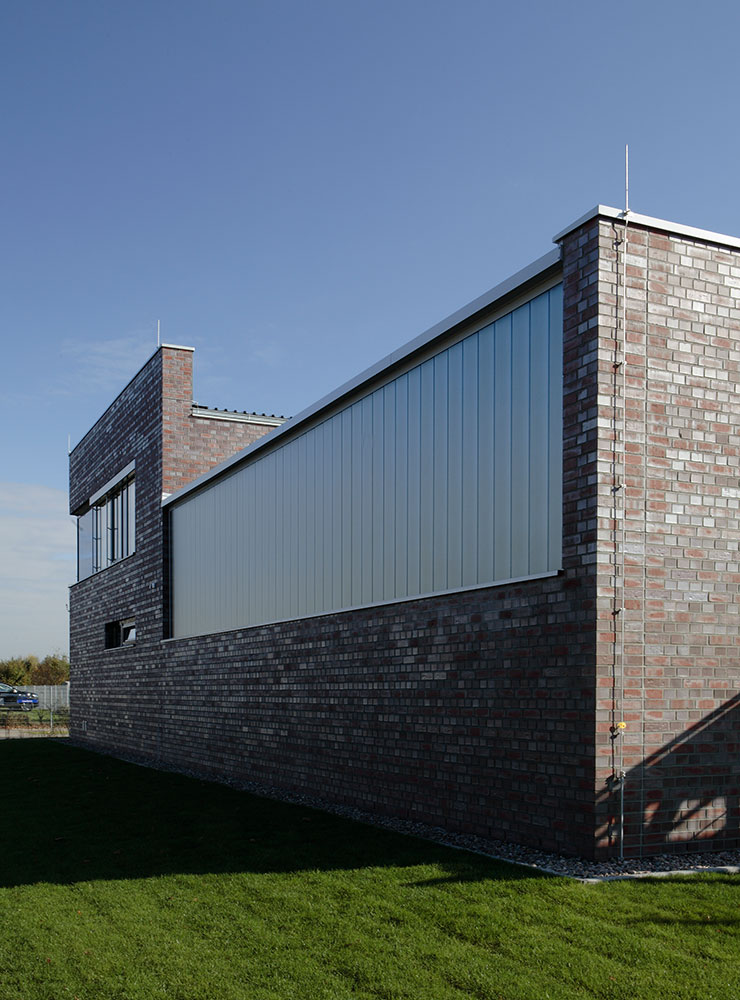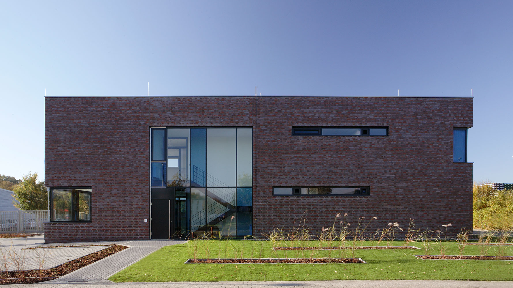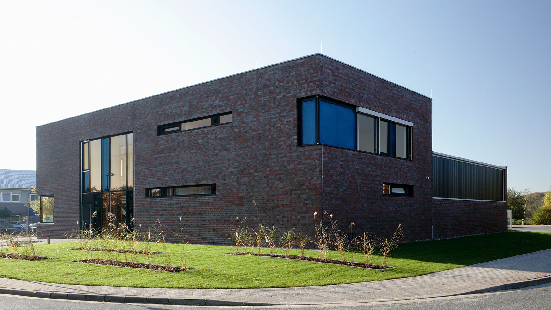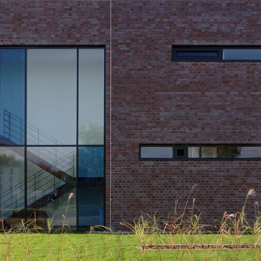 Der monolithisch wirkende Neubau verfügt über eine klare Grundrisstruktur. Das Material Ziegel umhüllt das gesamte Gebäude und verleiht ihm so ein einheitliches und selbstbewußtes Erscheinungsbild.