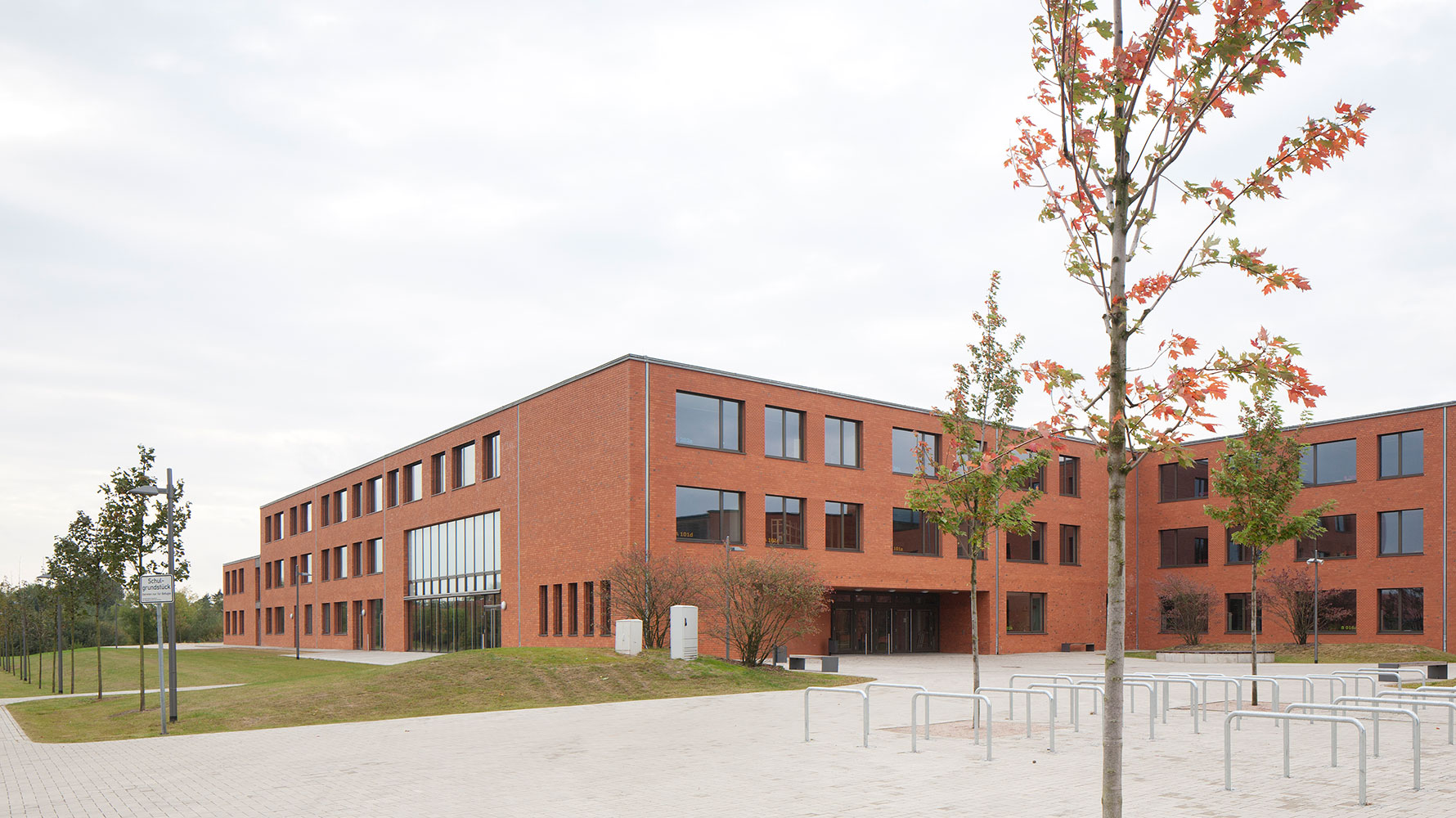 Die beiden linearen Baukörper bilden am Schnittpunkt der Hauptachse den Erschließungskern mit Hauptzugang und