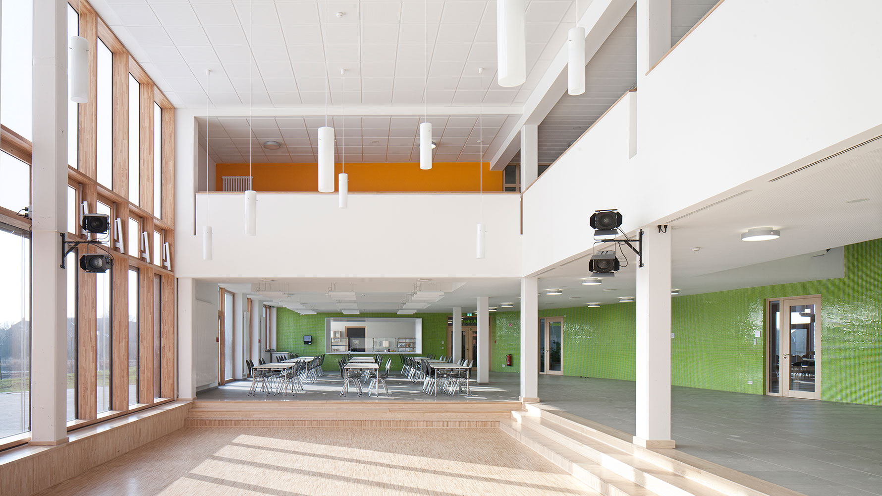 der sich weit zum rückwärtigen Schulhof öffnenden Aula. Daran anschließend befindet sich die Mensa, welche durch die räumliche Organisation dem Aulabereich bei Bedarf zugeschaltet werden kann.