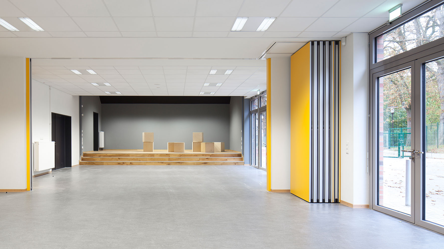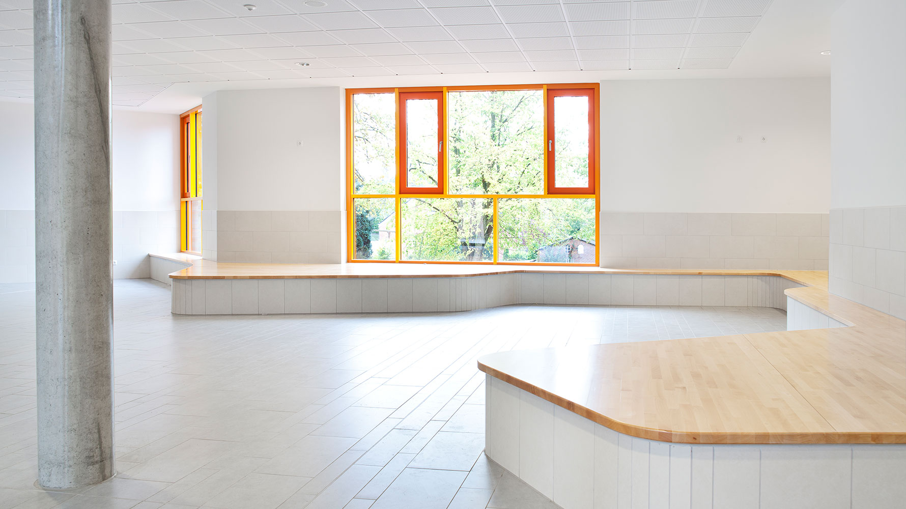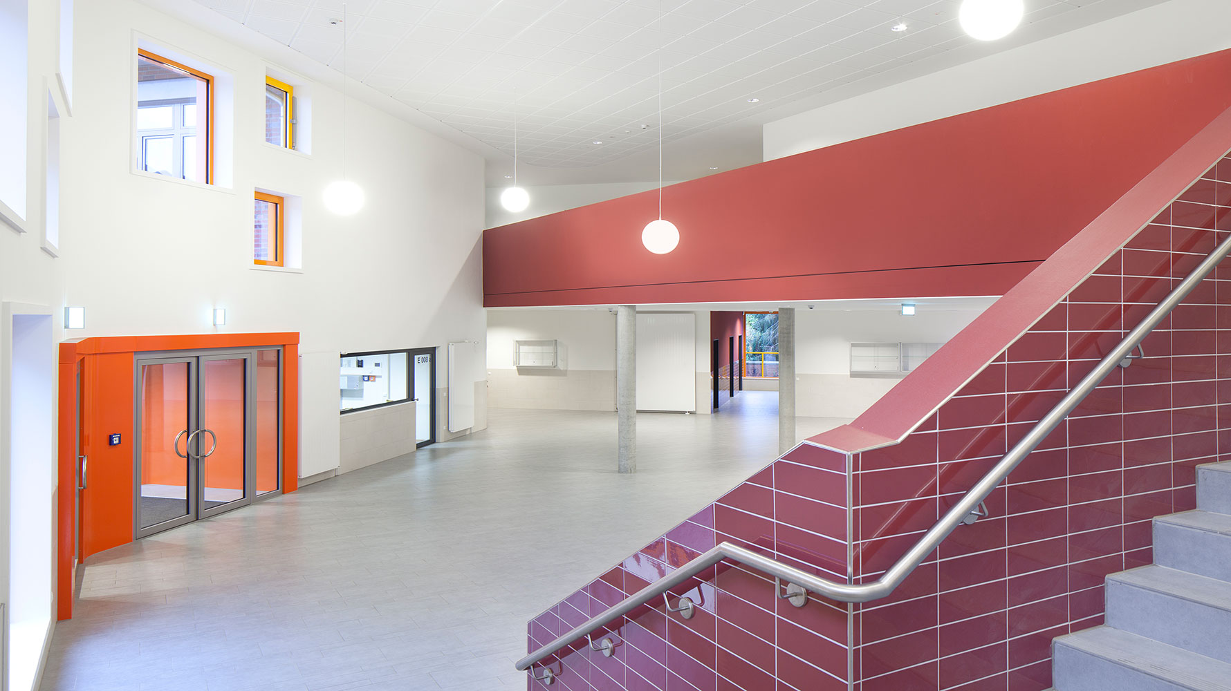 Der Athenaeum mit 12 neuen Unterrichts-, 3 Mehrzweck- und Fachräumen präsentiert sich als kompaktes Volumen mit klarer Eingangssituation. Der Eingang öffnet sich, um Schüler, Lehrer und Nutzer zu empfangen und führt sie durch die farbig gestaltete Pausenhalle zu den klar angeordneten Lernbereichen. Jeweils vier Unterrichtsräume, ein Lehrerbereich sowie eine Lerninsel bilden ein Cluster, das sich farblich voneinander unterscheidet und so Identität schafft.