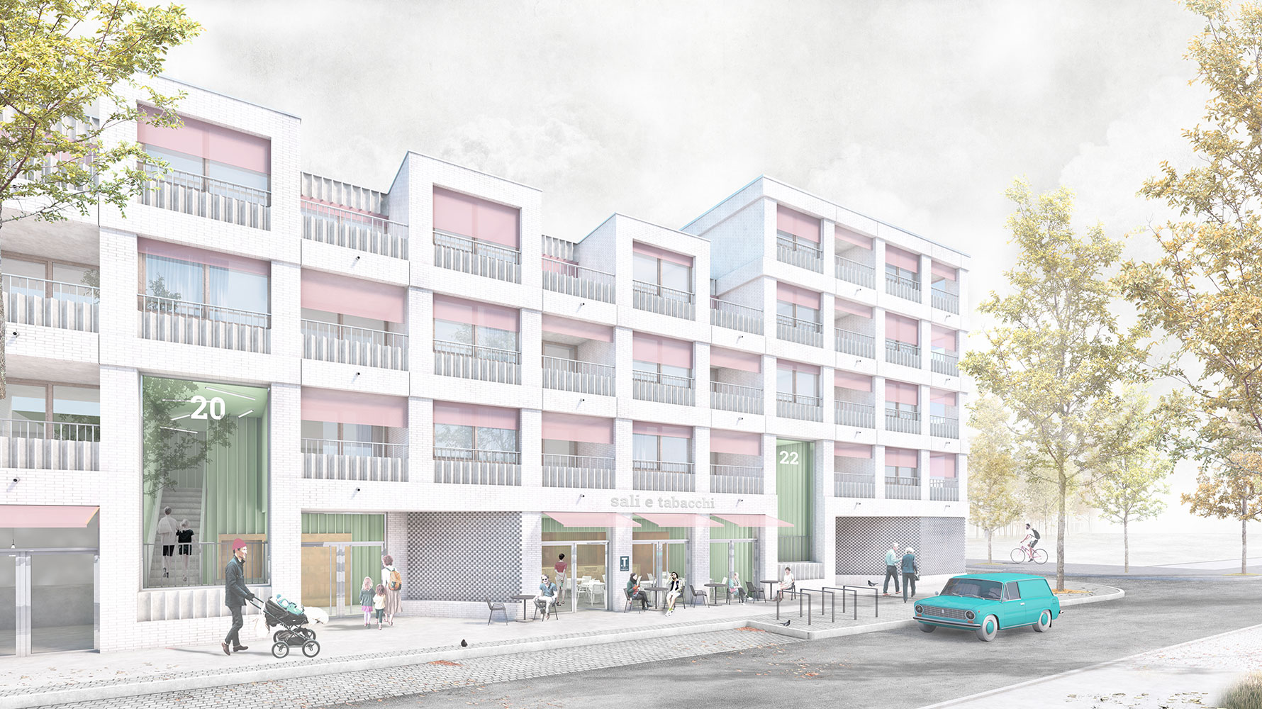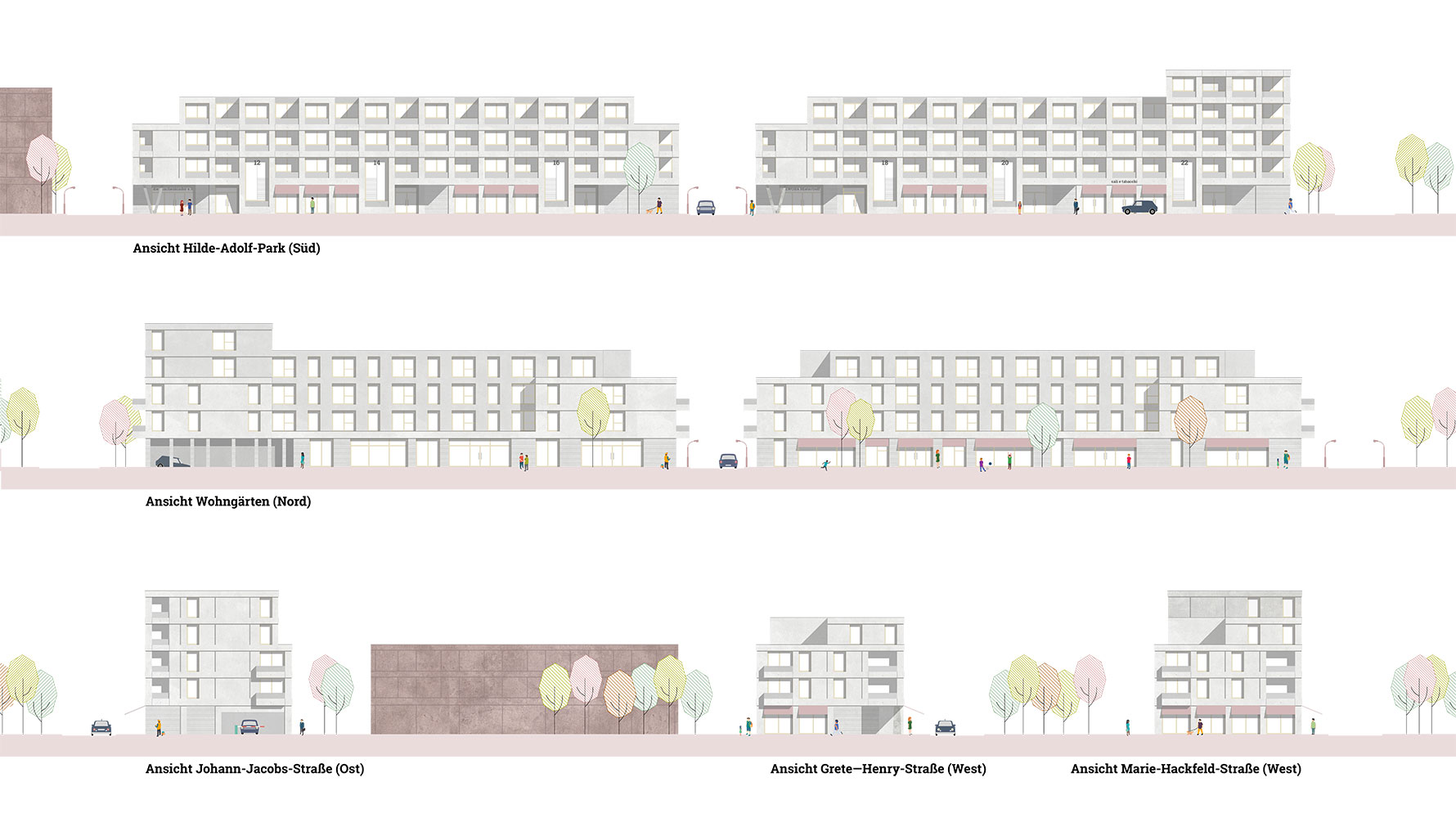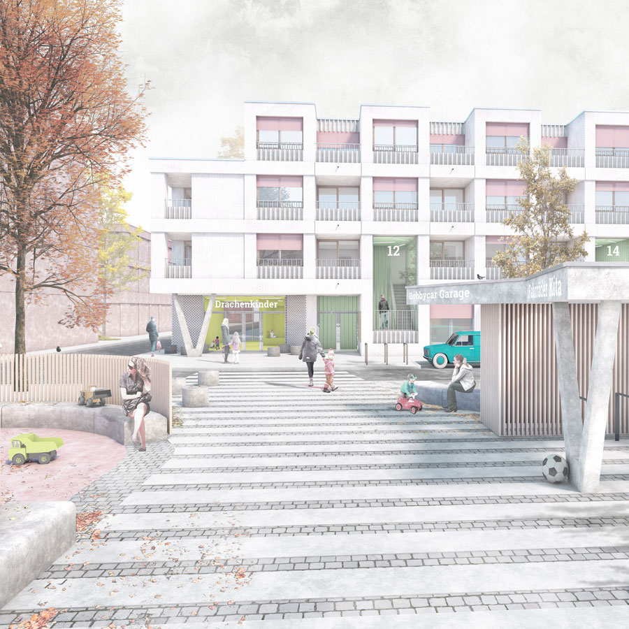 Die Aufgabe der Planung von zwei Wohngebäuden im Kaffeequartier löst ganz unmittelbar zwei Assoziationen aus: ‚Wohnen im Hafen‘ und ‚Wohnen am Park‘. Die Erscheinung der Fassade sowie deren Materialisierung nimmt Bezug auf die vorhandene Hafenarchitektur; für Bremen heißt dies im Wesentlichen die Architektur der 50er bis 70 Jahre des vergangenen Jahrhunderts. Diese wird in ein zeitgemäßes Erscheinungsbild übersetzt. Serielität sowie Rahmen und Füllung sind bestimmende Themen und werden im vorliegenden Entwurf mit seiner grauen Ziegelhaut und den keramischen Füllungen adaptiert. Beide Gebäude sind bewusst als Einheit und auch in Ihrer Länge homogen gestaltet. Ort und Umgebung vertragen diesen Maßstab. Die zulässigen Staffelgeschosse ergeben sich durch die Struktur aus Loggien und Fenstern in den darunterliegenden Geschossen sinnfällig und stärken die homogene Erscheinung des Ensembles.