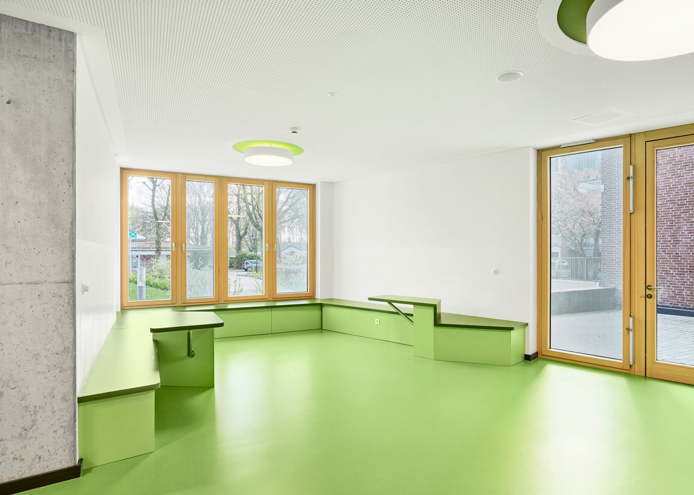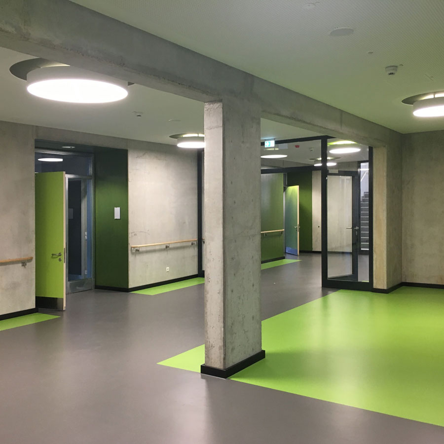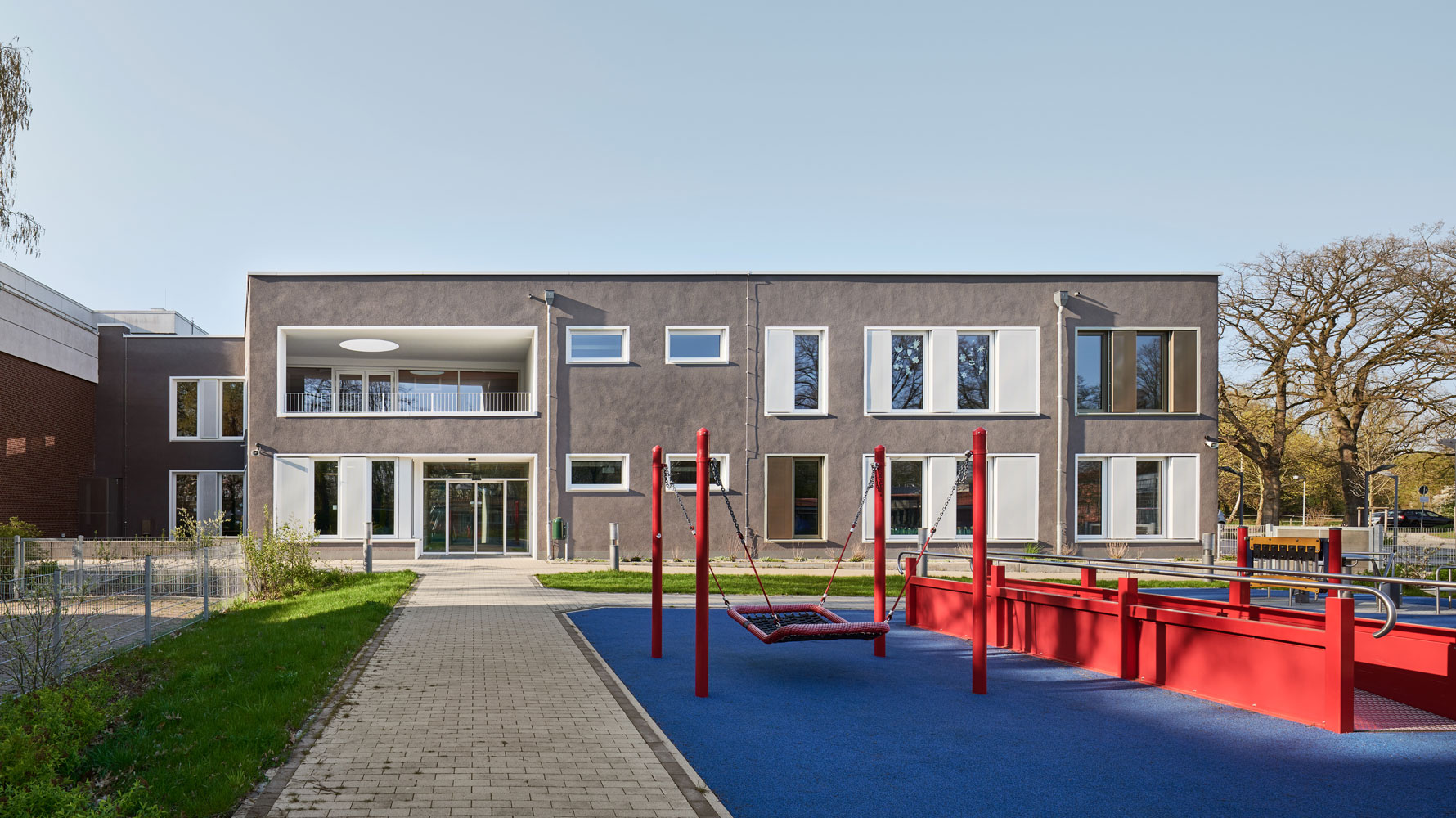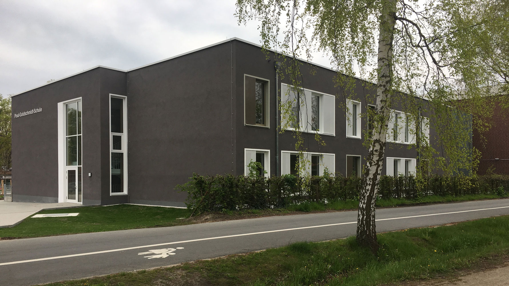 Der Zugang zum neuen Schulbau befindet sich auf der Rückseite und dient gleichzeitig als Hauptausgang in den neuen Schulhof. Der 2-geschossige Erweiterungsbau ist in Passivhausbauweise errichtet worden. Eine Kombination aus einer massiven hochgedämmten Außenwand mit speicherfähigen Innenwänden und Dach- und Geschossdecken aus Stahlbeton bildet die Grundlage für die Umsetzung der hohen Anforderungen des Energiekonzeptes.