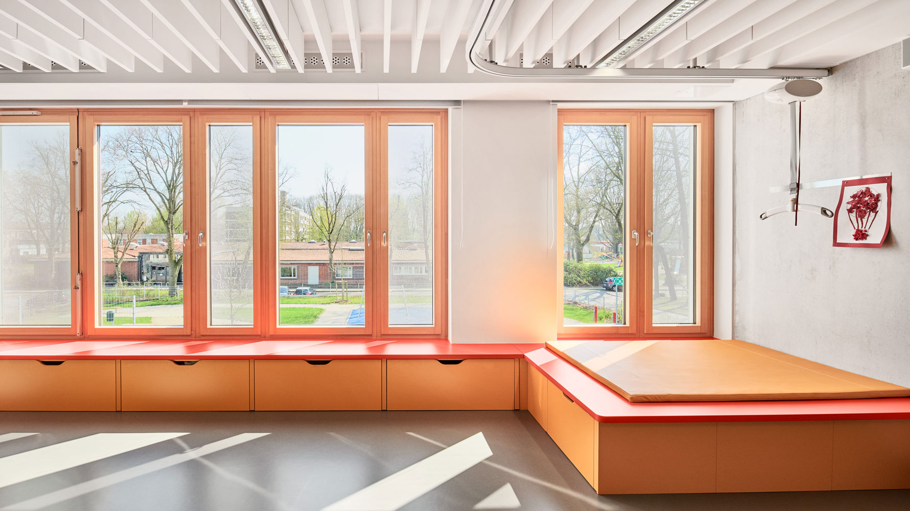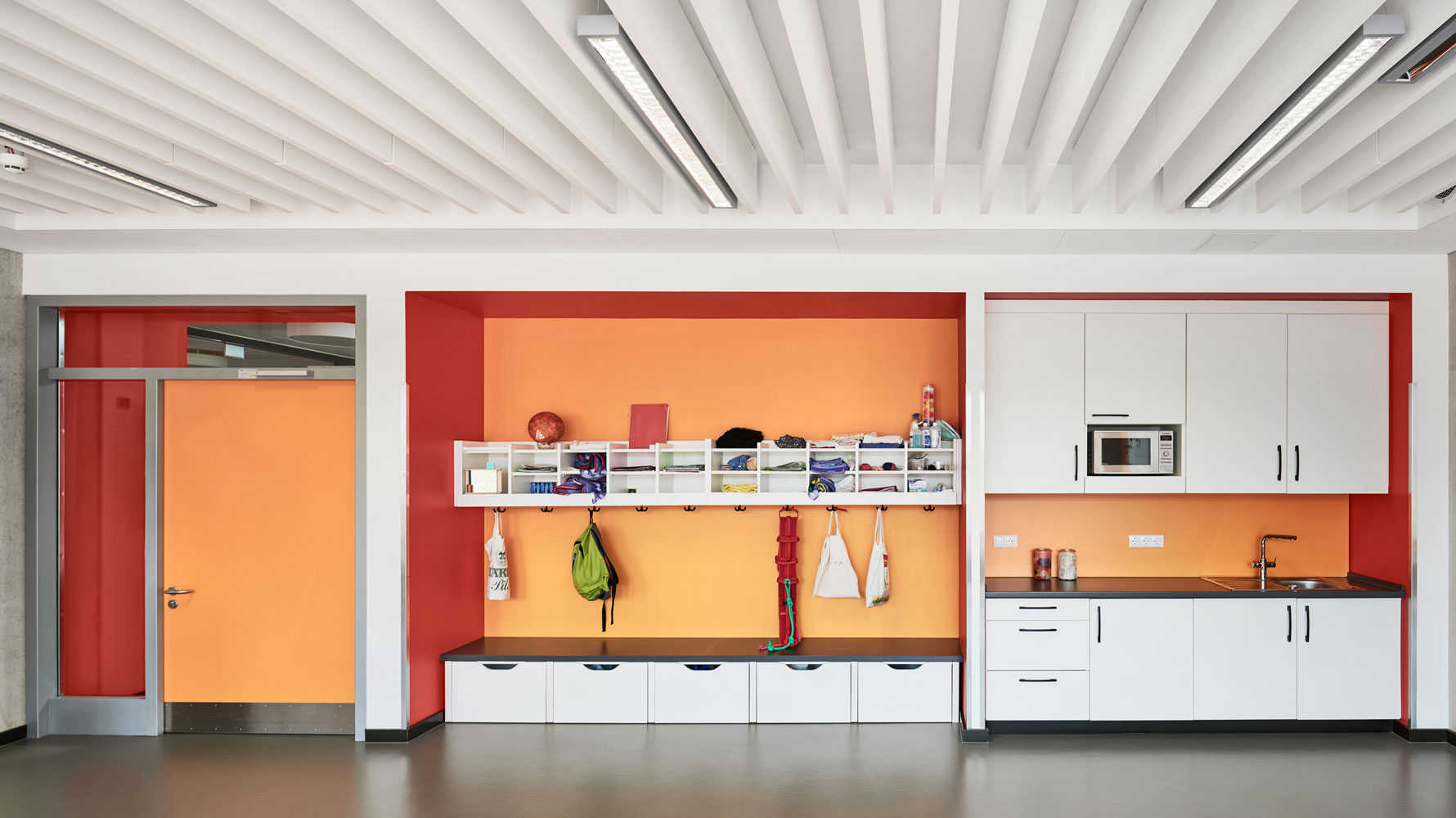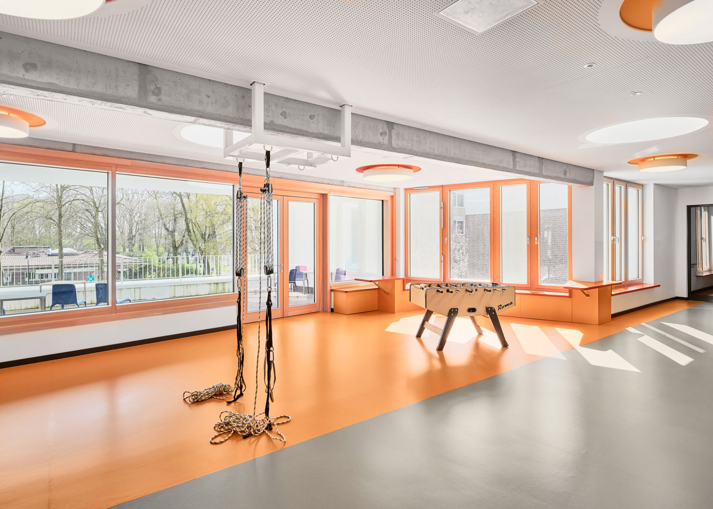 Der Zugang zum neuen Schulbau befindet sich auf der Rückseite und dient gleichzeitig als Hauptausgang in den neuen Schulhof. Der 2-geschossige Erweiterungsbau ist in Passivhausbauweise errichtet worden. Eine Kombination aus einer massiven hochgedämmten Außenwand mit speicherfähigen Innenwänden und Dach- und Geschossdecken aus Stahlbeton bildet die Grundlage für die Umsetzung der hohen Anforderungen des Energiekonzeptes.