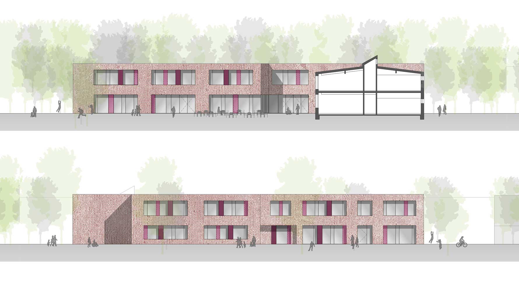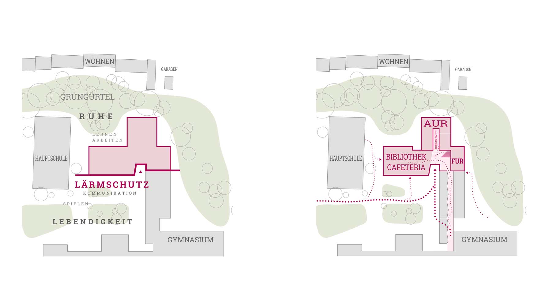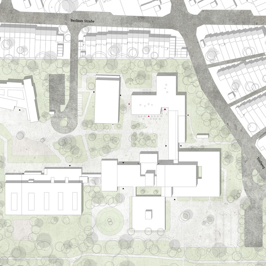 Das Schulgrundstück ist durch verschiedene Schulformen und Stile geprägt. Die Verteilung des Bestandes bildet sich weitesgehend im Norden, Süden und Osten ab, wodurch sich eine großzügige, zusammenhängende Schulhoffläche ergibt. Das neue Schulhaus soll diese Haltung unterstreichen und zeichnet sich durch eine klare und kompakte Weiterentwicklung des vorhandenen Ensembles aus.