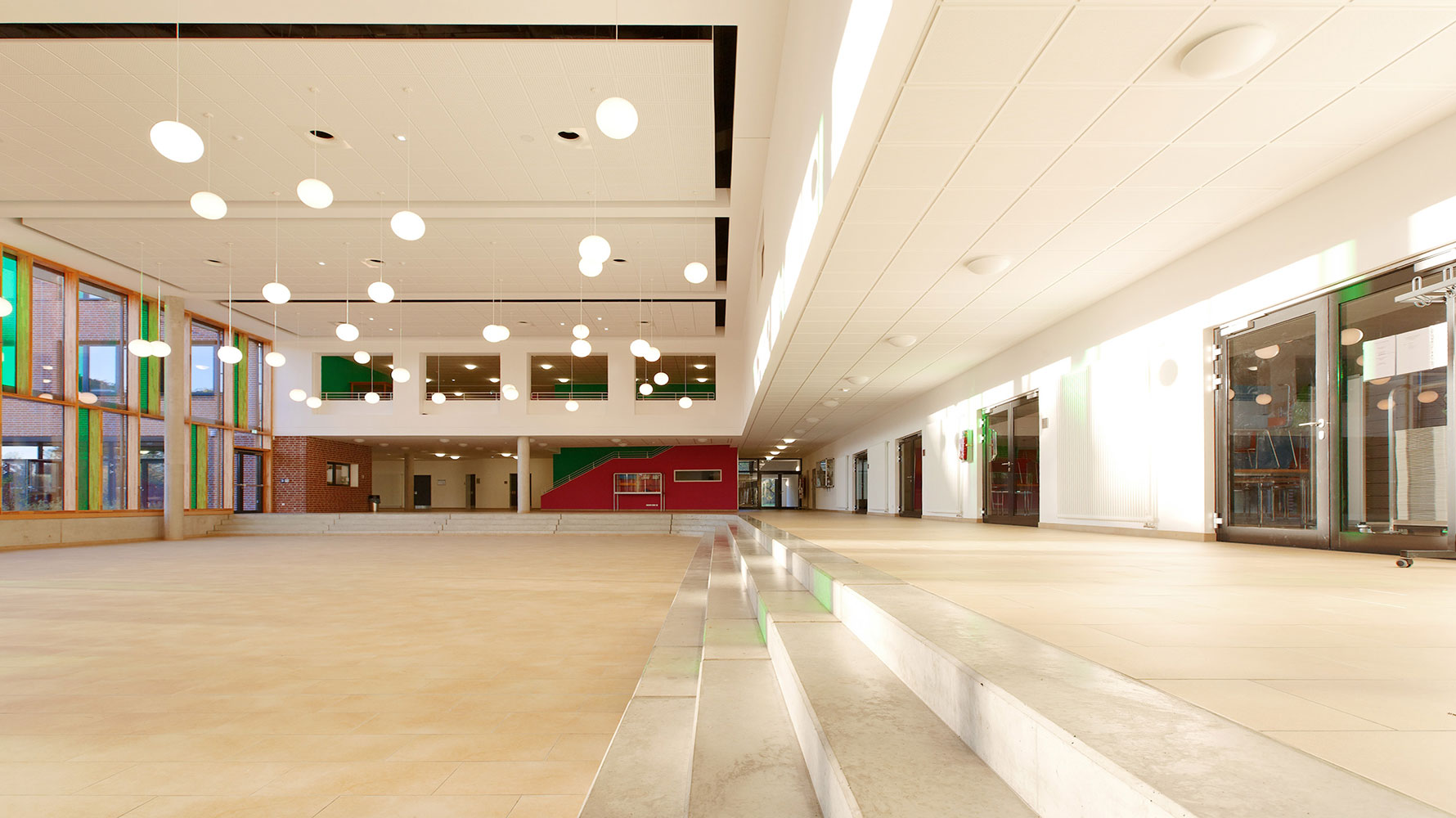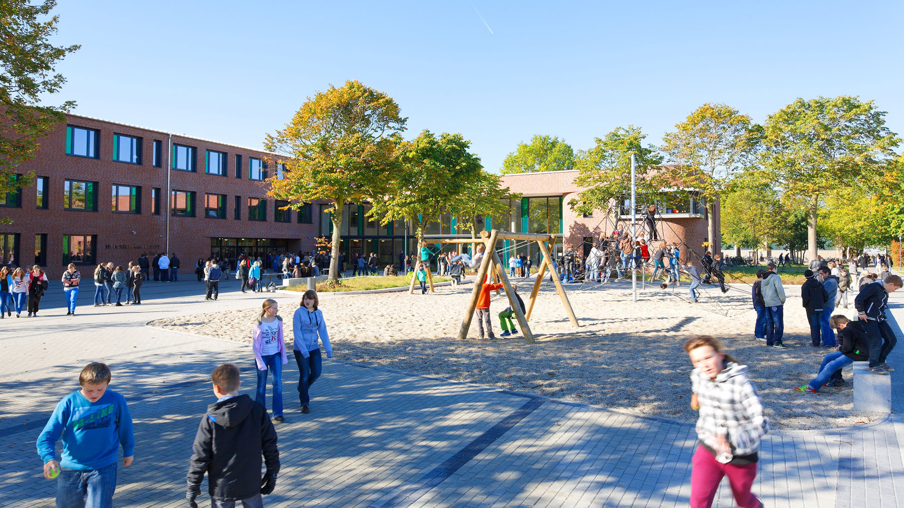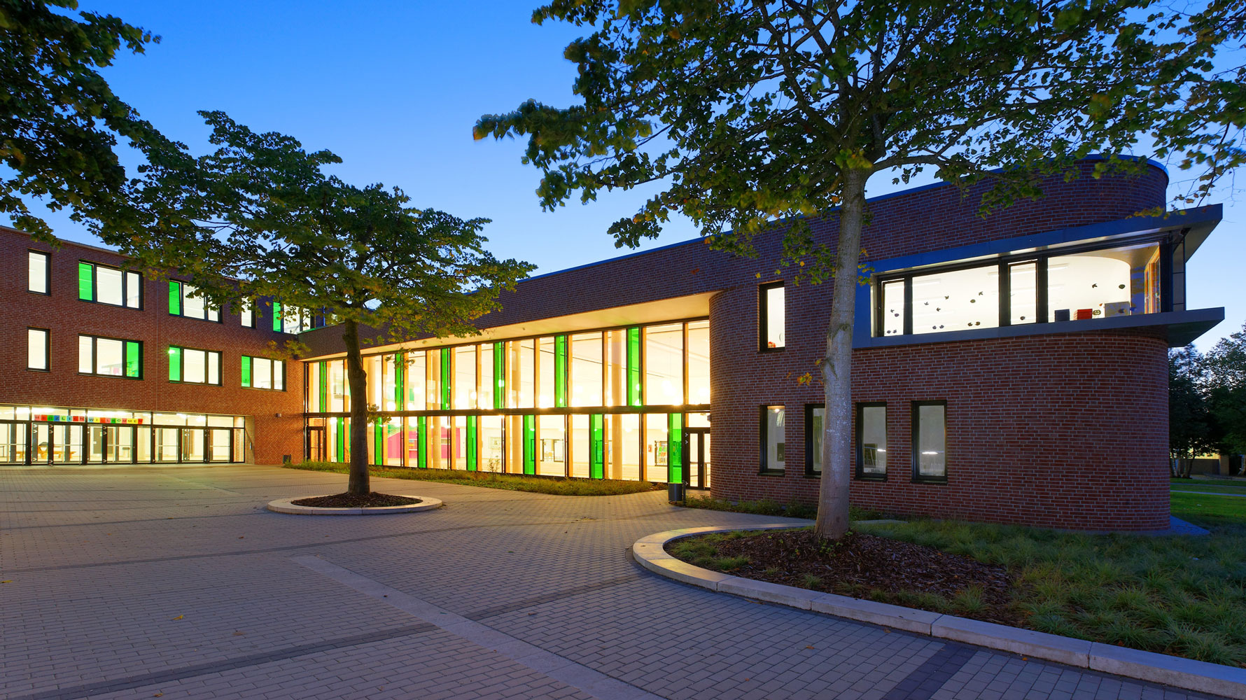 Der neue Schulbau präsentiert sich als neue Adresse als gut wahrnehmbare „Schule im Park“. Über eine breite Promenade und einen großzügigen Vorplatz gelangen die Schüler und Lehrer zum Haupteingang. Der Eingangsbereich ist großflächig verglast und somit hell und offen gestaltet. Der kompakte Baukörper des Neubaus ist in L-Form aus einem 3-geschossigen Riegel in Nord- Süd-Ausrichtung mit Unterrichtsbereichen und einem 2-geschossigen Kopfbau mit Ganztagesfunktionen auf dem vorgegebenen Baufeld angeordnet.