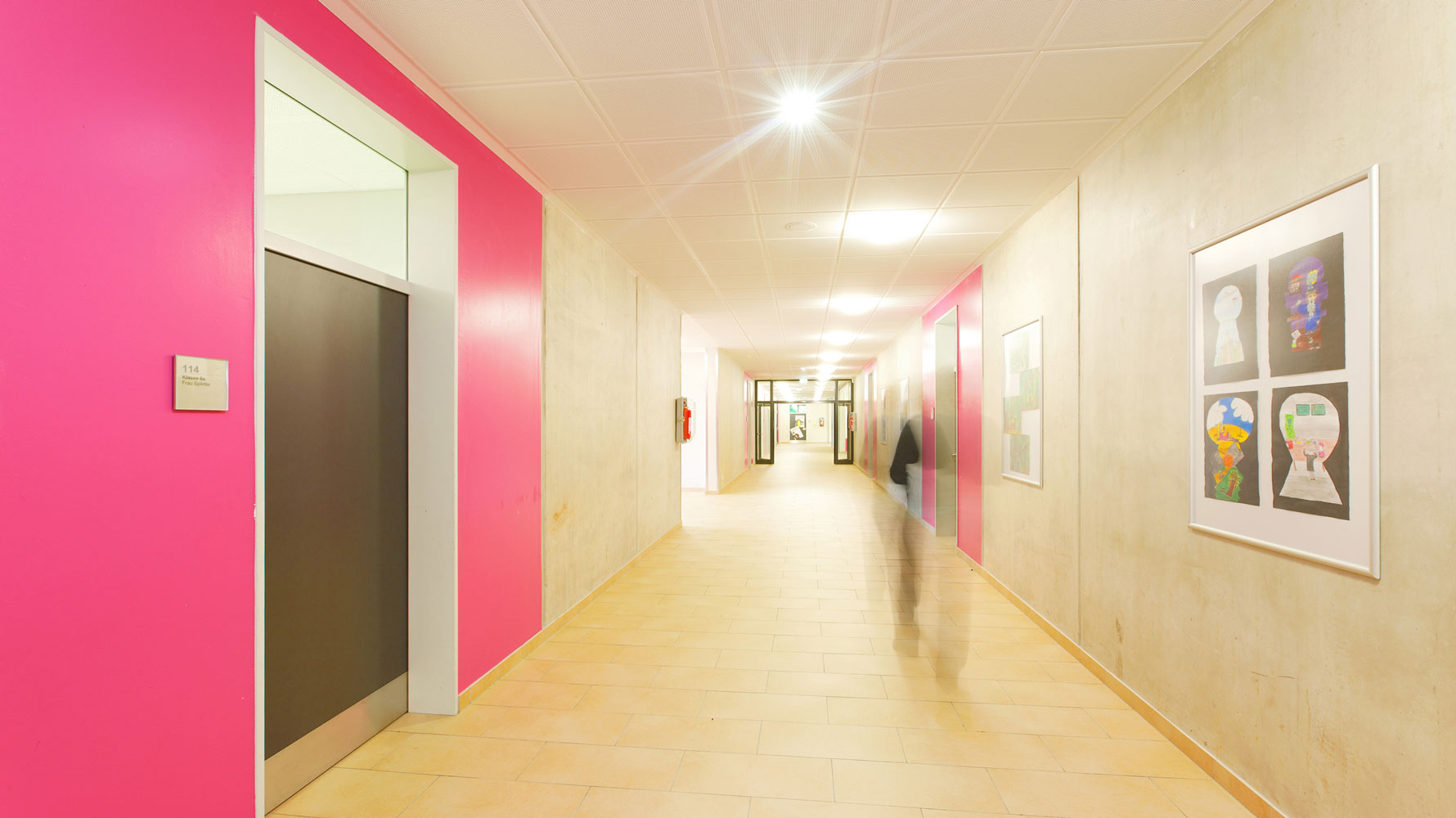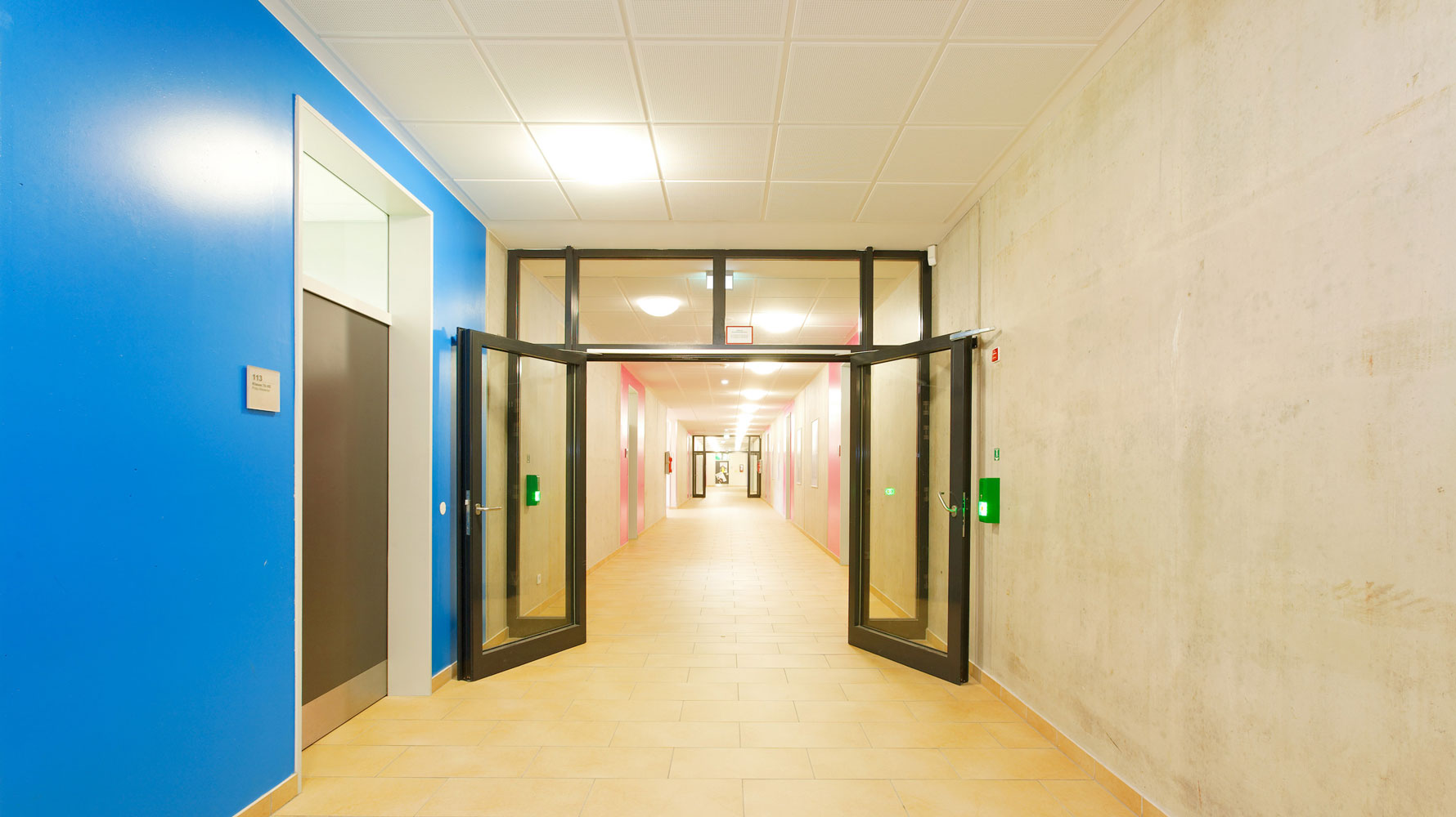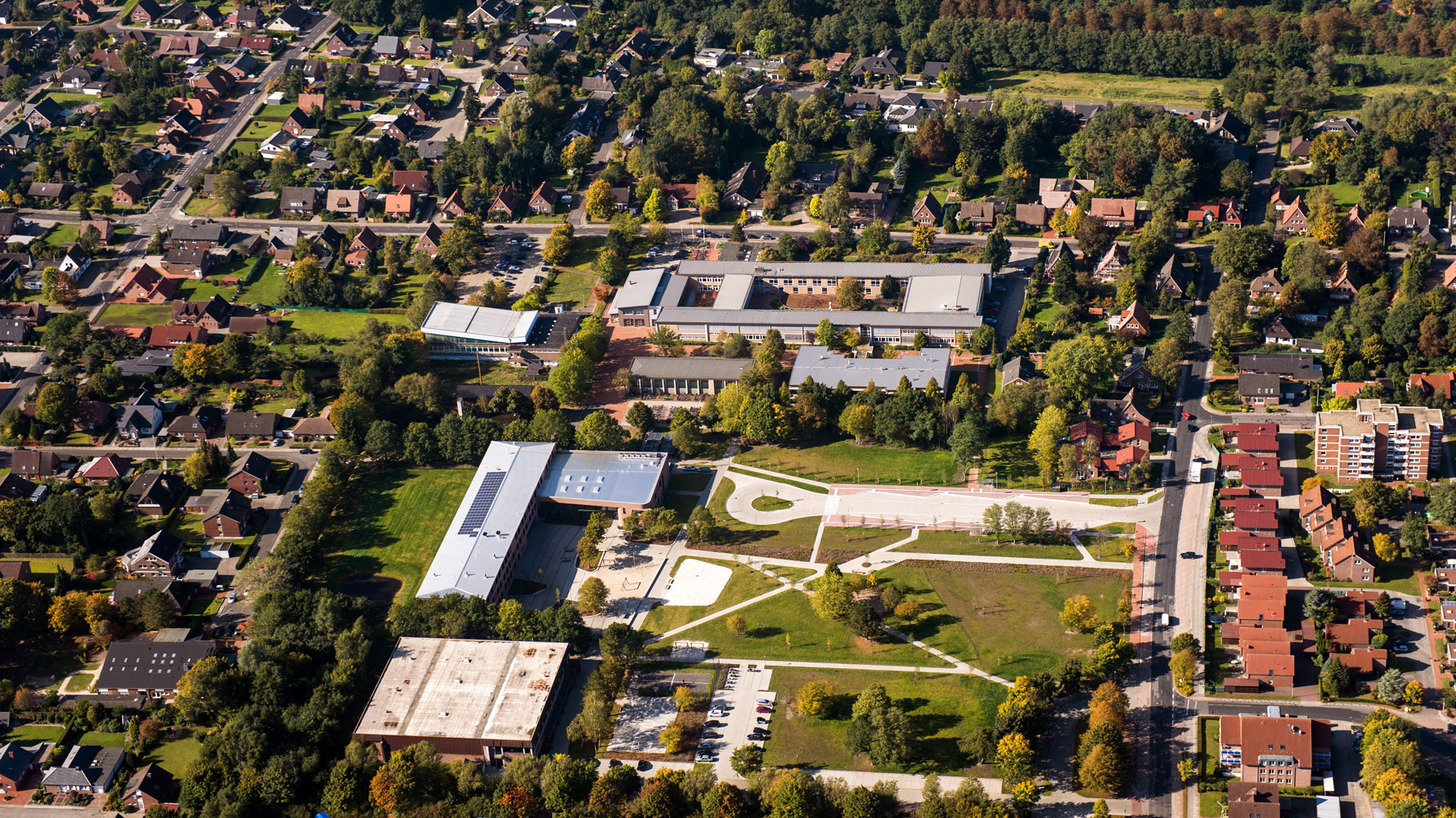 Der neue Schulbau präsentiert sich als neue Adresse als gut wahrnehmbare „Schule im Park“. Über eine breite Promenade und einen großzügigen Vorplatz gelangen die Schüler und Lehrer zum Haupteingang. Der Eingangsbereich ist großflächig verglast und somit hell und offen gestaltet. Der kompakte Baukörper des Neubaus ist in L-Form aus einem 3-geschossigen Riegel in Nord- Süd-Ausrichtung mit Unterrichtsbereichen und einem 2-geschossigen Kopfbau mit Ganztagesfunktionen auf dem vorgegebenen Baufeld angeordnet.