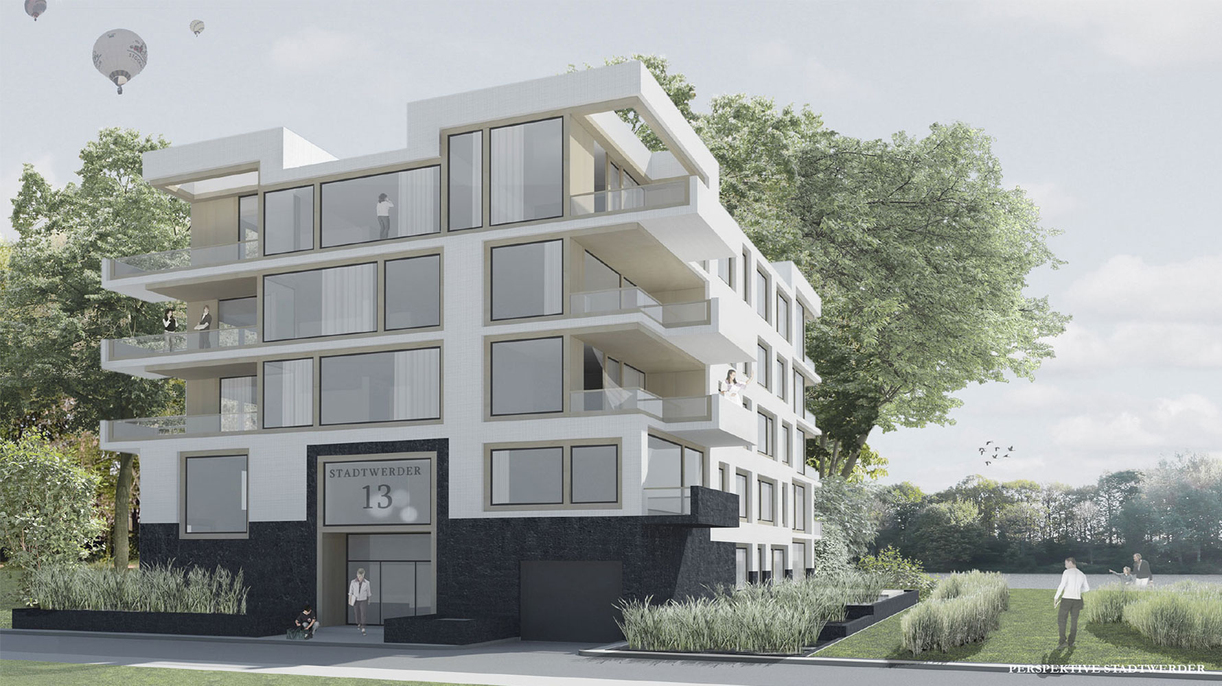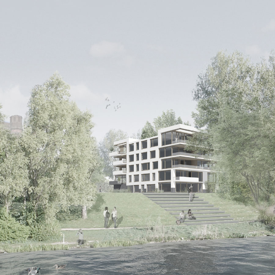 Alle Wohnungen öffnen sich mit Loggien / Balkonen oder Terrassen zum Wasser und zum Licht. Die Erhöhung der Wohnräume im jeweils obersten Geschoss bilden plastisch stark ausformulierte Gebäudeabschlüsse: in eine Stadt- und eine Wasserseite. Die plastische und habtische Materialität sowohl des Terrassenplateaus, als auch der Sockelzone erinnert an die klassische Rustica, und verankert die Bauten damit fest am Ufer des Stadtwerders.
