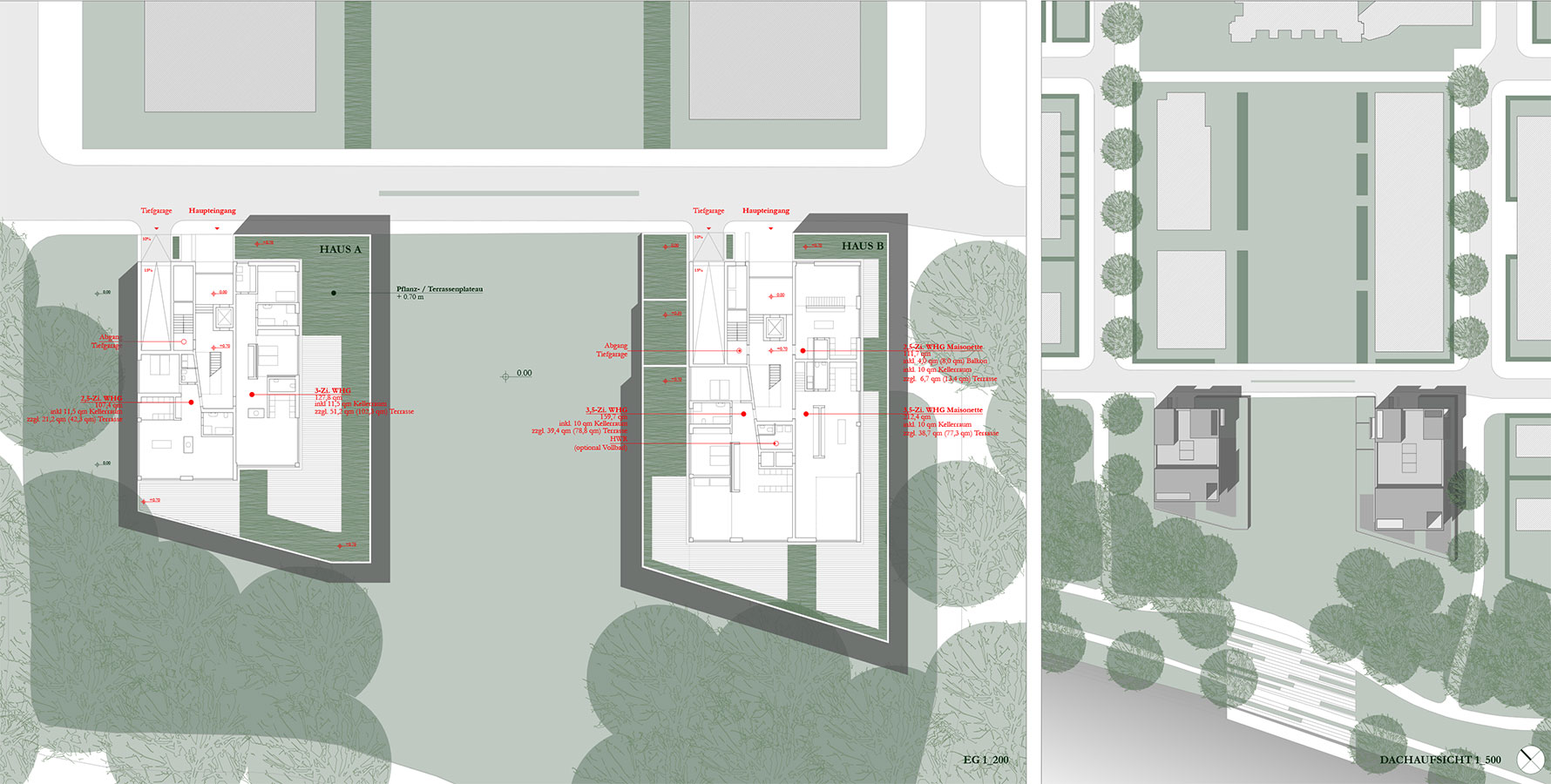 Die beiden Wohngebäude entwickeln sich, der Eigenschaft des Ortes folgend, von der Straßen- bzw. Stadt-Seite hin zum Ufer des Werdersees. Dieser klaren Ausrichtung folgt sowohl die Organisation der Erschließung, als auch die Grundanlage der Wohnungen.